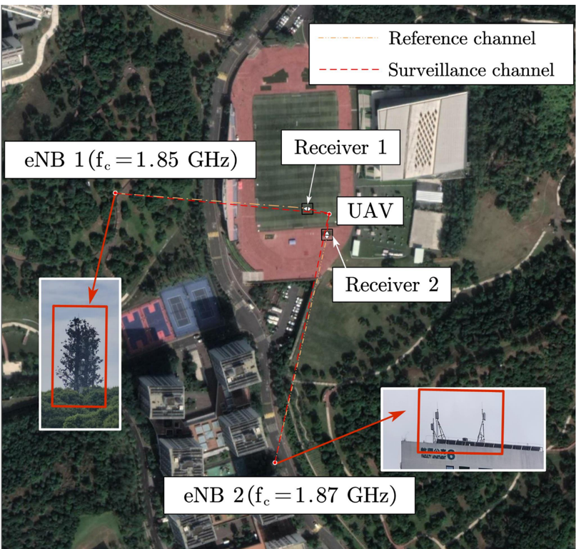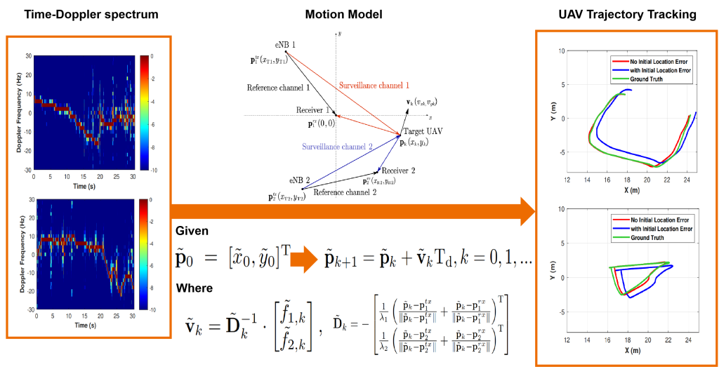基于通信信号的低空无人机感知 基于LTE蜂窝基站的下行通信信号,感知通信环境中的低空无人机目标,并对无人机进行准确追踪。 接收天线为阵列天线,LTE蜂窝基站距离无人机目标约为200m,接收机距离无人机目标约为30m。 90%的轨迹追踪误差低于0.5m,实现分米级的无人机轨迹跟踪。