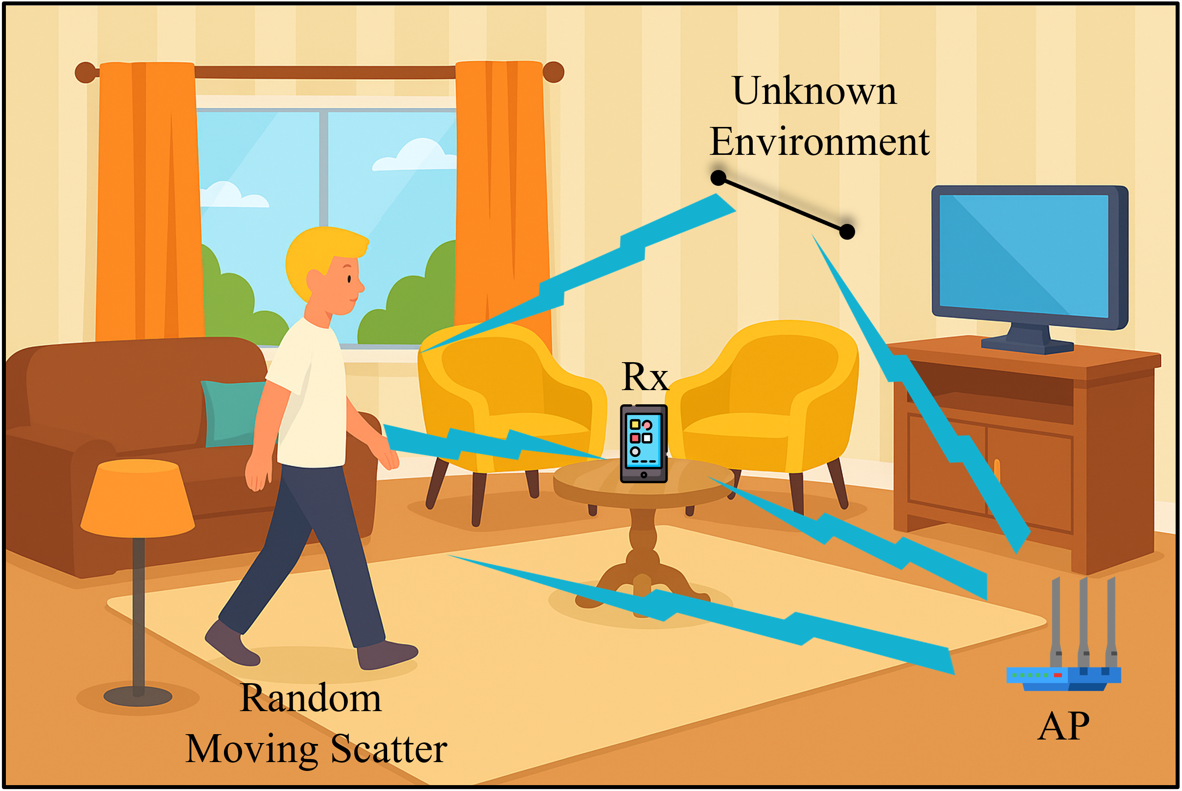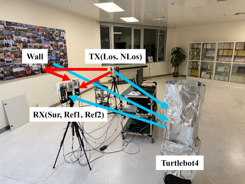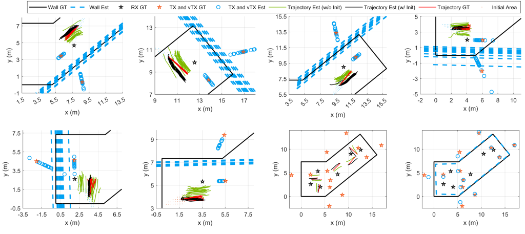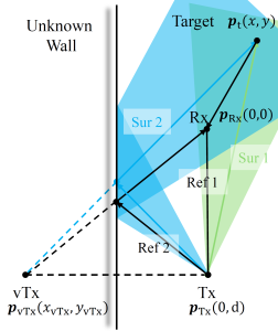 The target trajectory is estimated by jointly exploiting two signal paths: one line-of-sight (LoS) path and one wall-reflected non-line-of-sight (NLoS) path. Each path provides a distinct Doppler measurement corresponding to a different geometric line, and the combination of these two Doppler constraints enables two-dimensional motion estimation of the passive target. Meanwhile, the wall-reflected path is modeled as a virtual receiver, whose location can be inferred from the observed reflections, allowing the wall position and environmental layout to be reconstructed without dedicated sensing hardware.